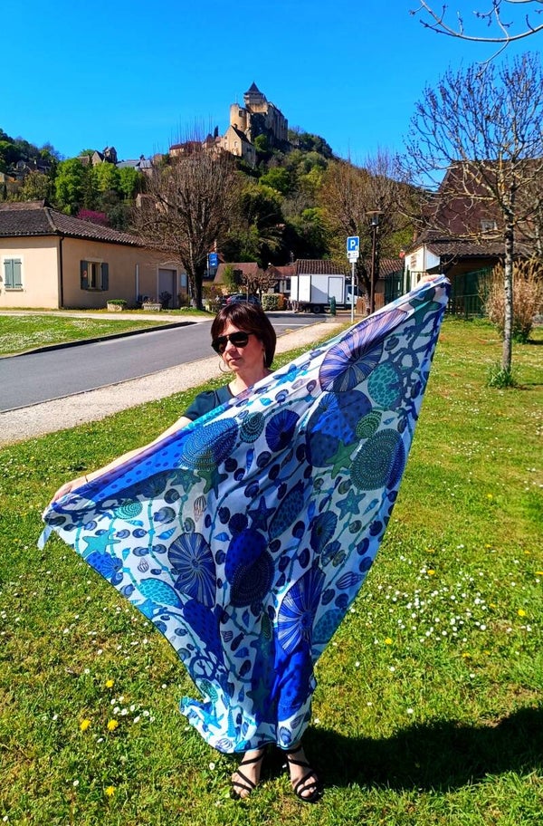 Le motif "Bleu Lagon" est mis en valeur des deux côtés, vous permettant d'en profiter pleinement quelle que soit la façon dont vous le porter. Veuillez noter qu'en raison du procédé d'impression et de la construction unique du foulard, xhacin peut être doté d'une délicate bordure blanche autour de l'ourlet, ce qui rehausse son charme gébéral.
