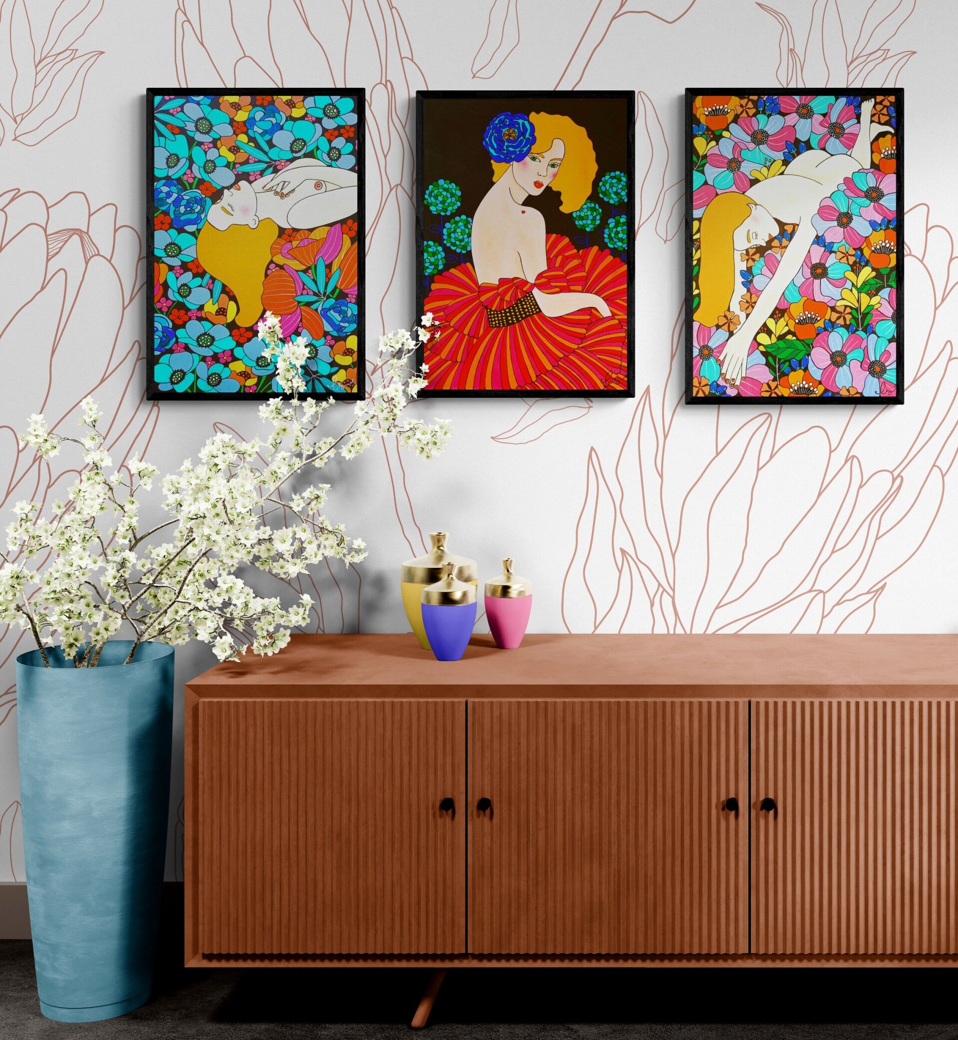 Au cœur de ce tableau, se dresse une femme blonde dont le regard invite le spectateur à entrer dans son univers.